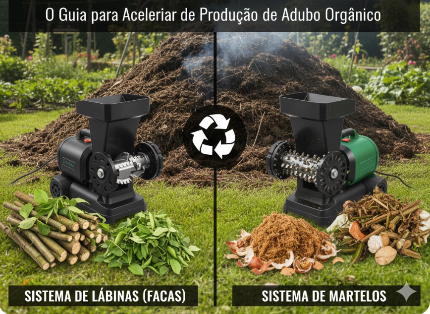 Regra de Ouro: Se seu lixo é 80% galho de árvore, compre Lâminas. Se é mistura de grama, folhas e resto de horta, compre Martelos.